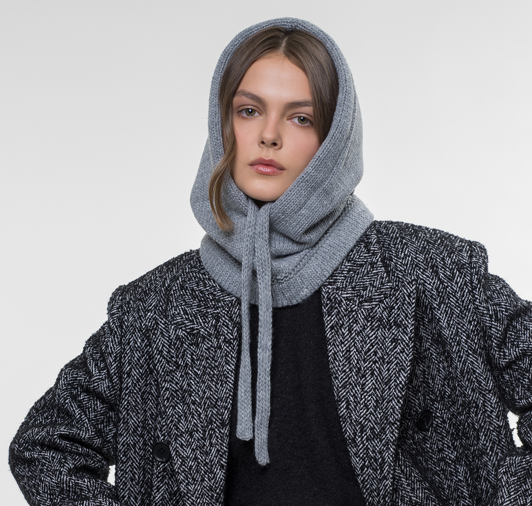 Капор со свободной посадкой, увеличенной глубиной капюшона и шнуровкой. Модель защищает от холода и ветра не только голову, но также шею и верхнюю часть груди. Этот капор доступен в разных оттенках стильного серого цвета.