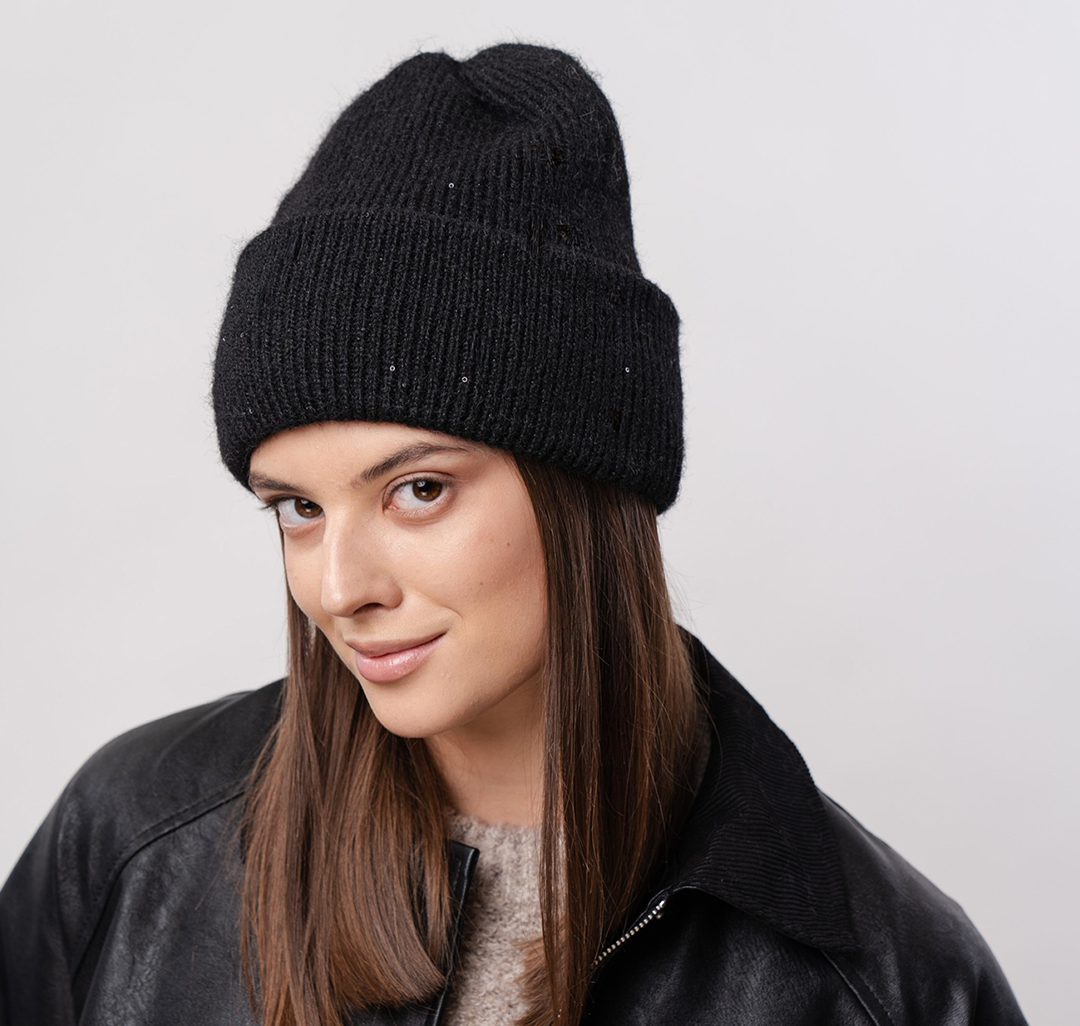 Классическая шапка-бини с отворотом с фактурой в мелкий рубчик и россыпью миниатюрных пайеток. Модель доступна в нескольких нейтральных цветах.