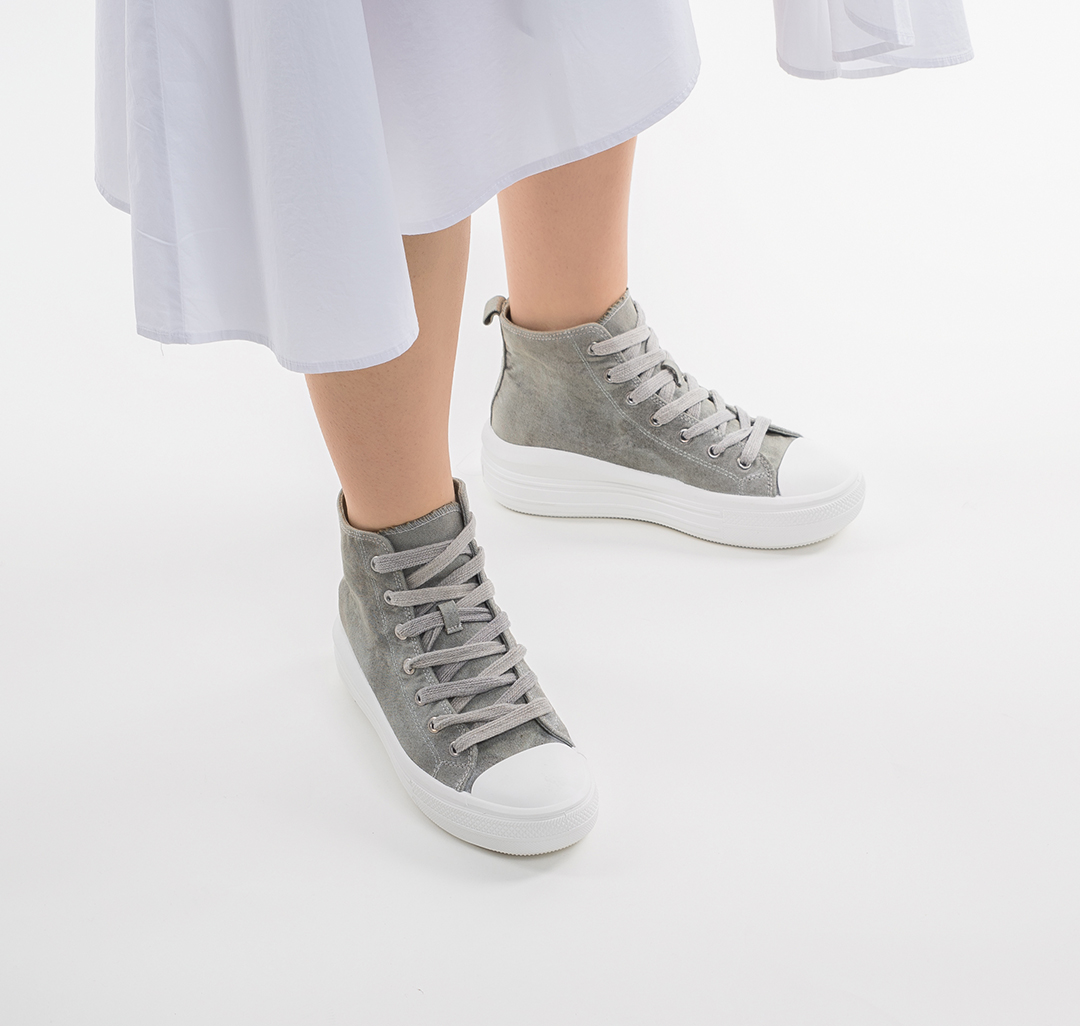 Базовые высокие кеды в универсальной серо-белой расцветке. Эта модель добавит в любой образ неформальности и расслабленности, при этом отлично сочетается и с джинсами, и с юбками или платьями.