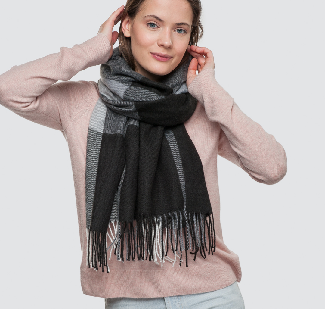 Палантин MARMALATO в крупную клетку с бахромой на концах. Отличительной особенностью этого предмета одежды является то, что его можно носить по-разному: сделать из него жилет с помощью ремня, повязать вокруг шеи, либо же просто носить как накидку на плечи.